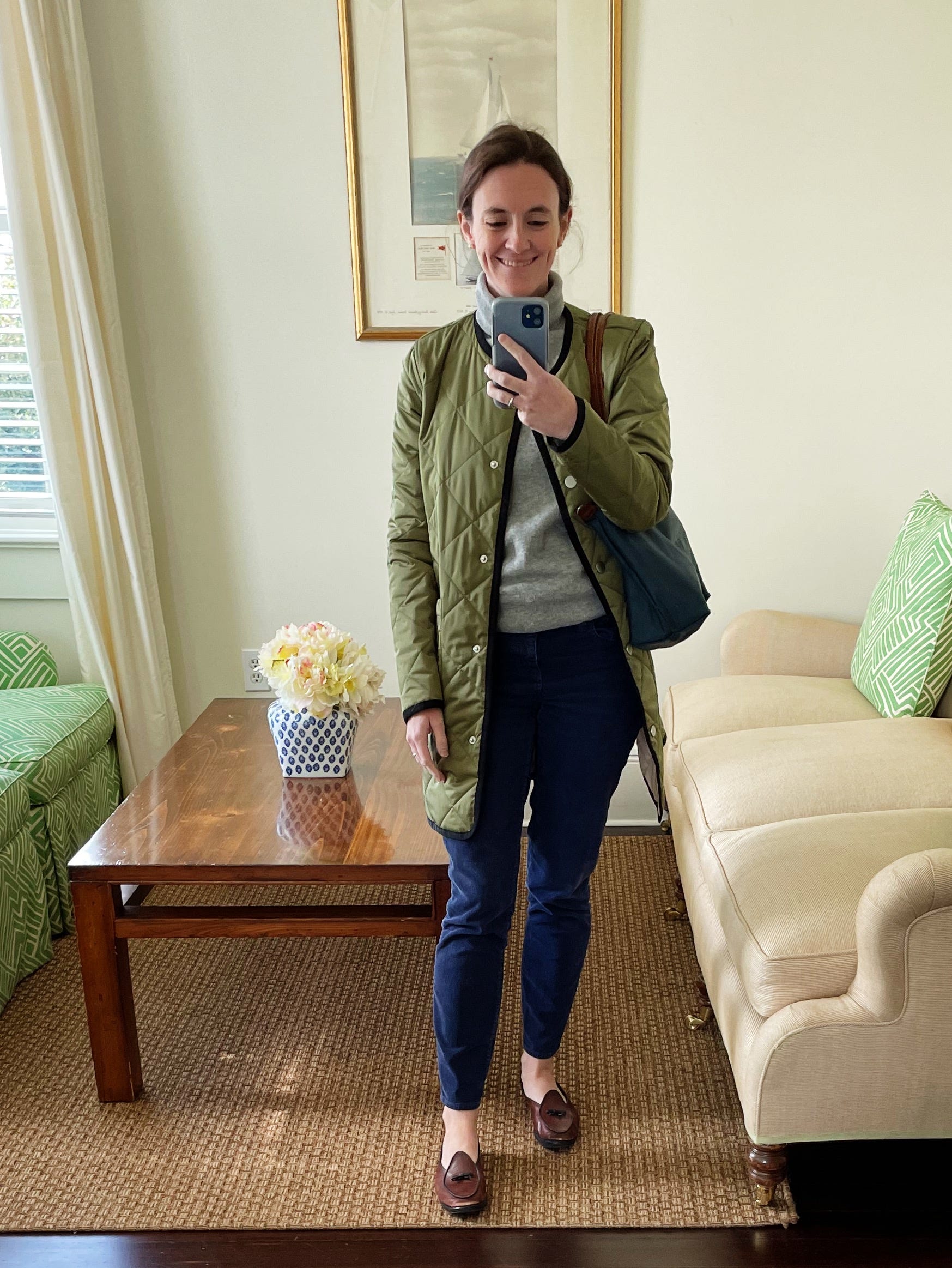 With a cashmere turtleneck, quilted jacket, corduroys, and a Longchamp for a board meeting