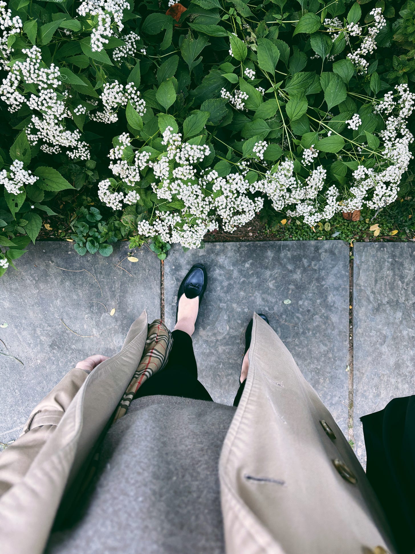 My mother’s trench coat, old La Ligne sweater (similar; 10% off La Ligne with FEWERBETTER10); gold necklace from Aurate (20% off with FEWERANDBETTER20), black trousers for a night out