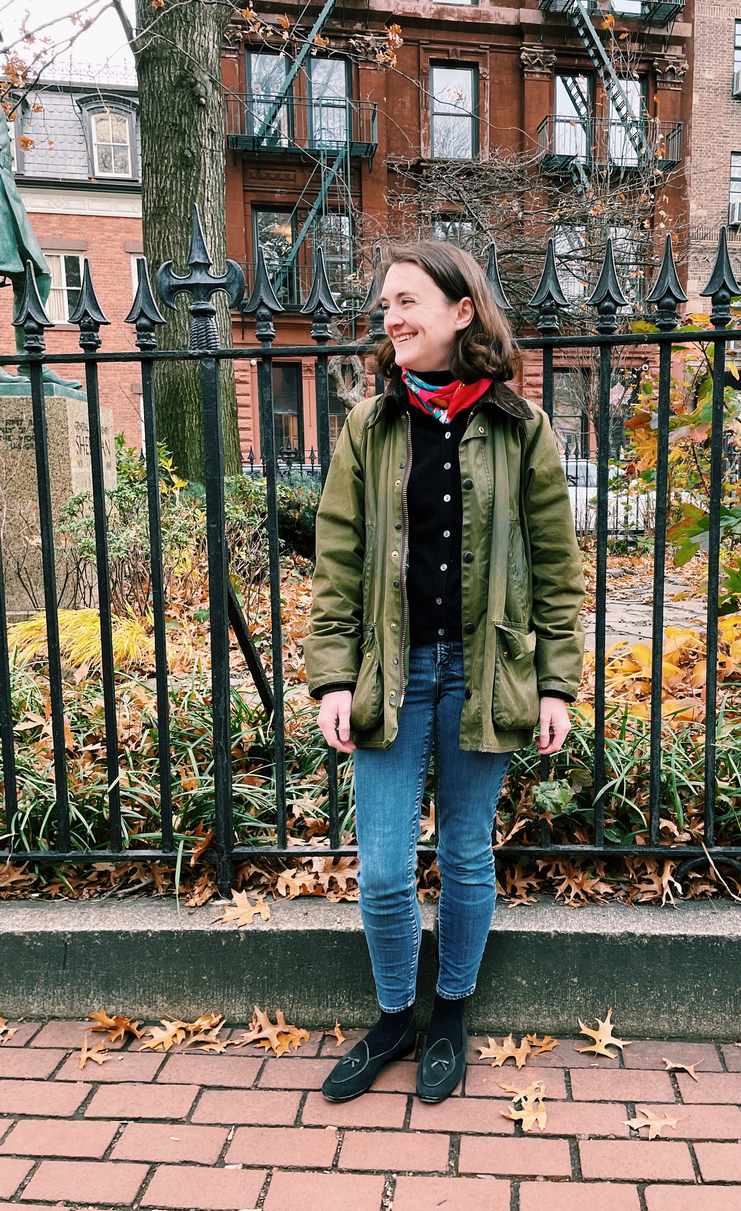 With a silk scarf, vintage cardigan (similar, 10% off with FEWERBETTER10), jeans (15% off with FEWER15), socks, and my mother’s old Barbour for an afternoon in the Village